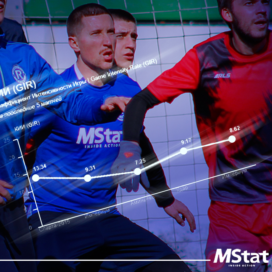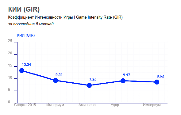 Коэффициент Интенсивности Игры (КИИ или GIR) - это простой и наглядный способ оценить, насколько интенсивно и активно команда действует на поле в течение матча, а также возможность оценить физическую и технико-тактическую готовность команды на данном соревновательном этапе.